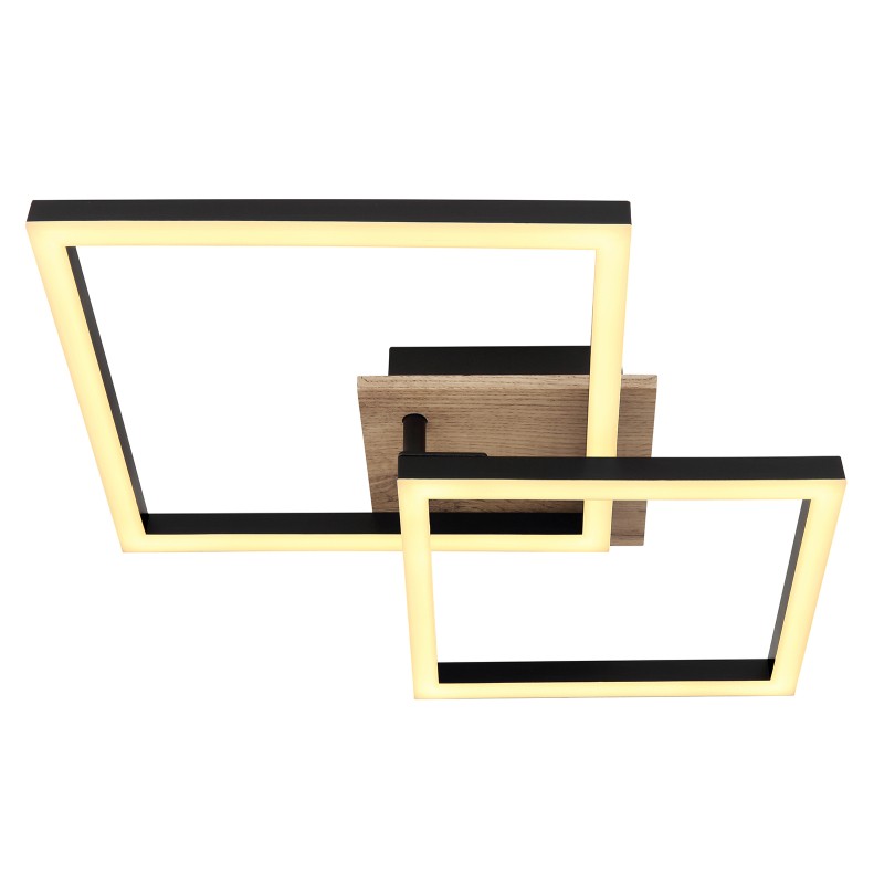 Dva LED panely vyčnívají z čtvercového stropního upevnění v dekoru dřeva, které vyzařují teplé bílé světlo 3000 K a vytvářejí tak příjemnou atmosféru. Svítidlo má rozměry 53 x 38 x 9 cm a je vybaveno integrovaným LED modulem o výkonu 18 W, napájeným 230 V. Světelný tok dosahuje hodnoty 2050 lm na zdroji a 1200 lm na výstupu.