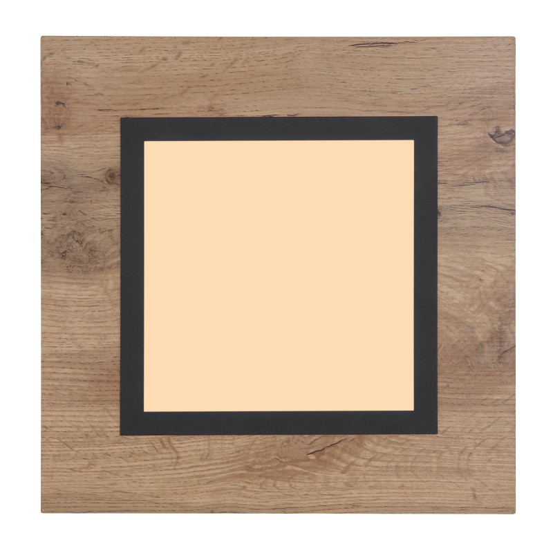 Na černém matném stropním nástavci je tvarovaný čtvercový MDF rám ve vzhledu dřeva o průměru 30 cm s opálovým plastovým krytem. Přiložený LED panel poskytuje teplé bílé světlo o teplotě 3000 K a zajišťuje tak příjemnou atmosféru v každém interiéru.
