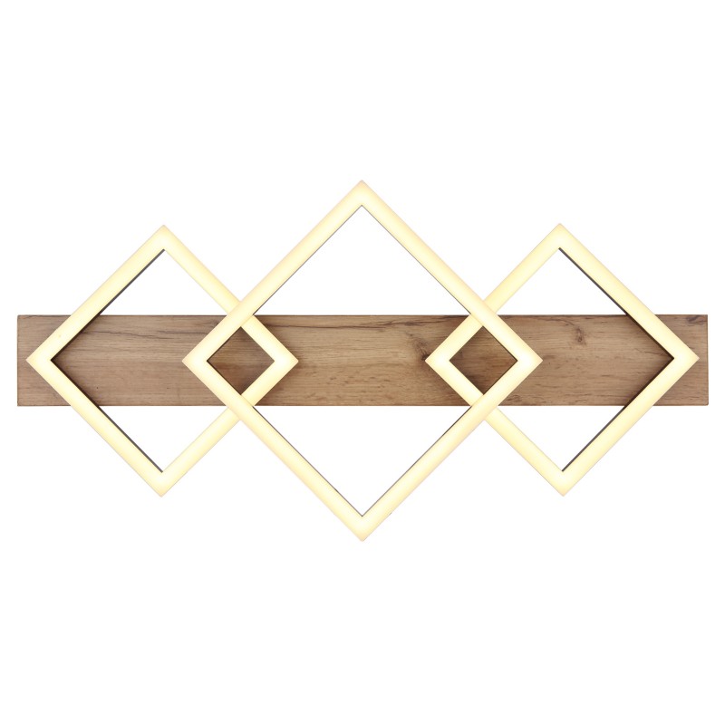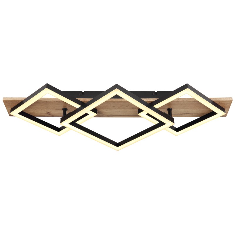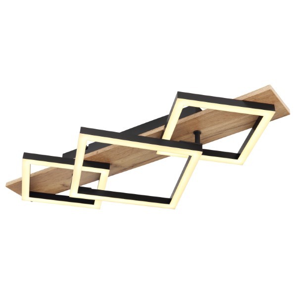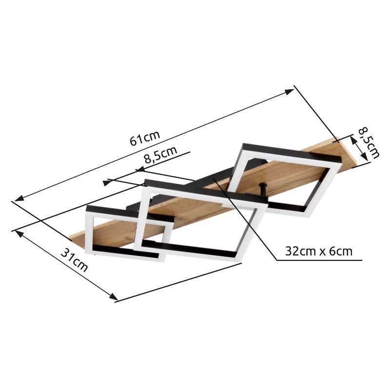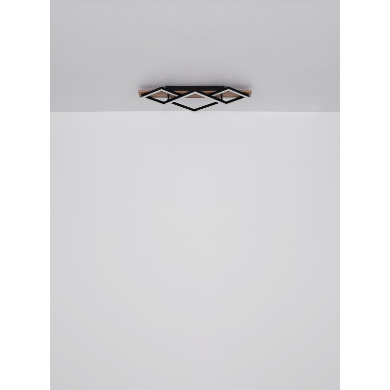 Svítidlo je vyrobeno z matně černě lakovaného kovu, MDF s efektem tmavého dřeva a opálového plastu. Svítidlo má rozměry 61 x 31 x 8,5 cm a je vybaveno integrovaným LED modulem o výkonu 24 W, napájeným 230 V. Světelný tok dosahuje hodnoty 2670 lm na zdroji a 1400 lm na výstupu. Barevná teplota 3000 K poskytuje příjemně teplé světlo, ideální pro vytvoření útulné a komfortní atmosféry.