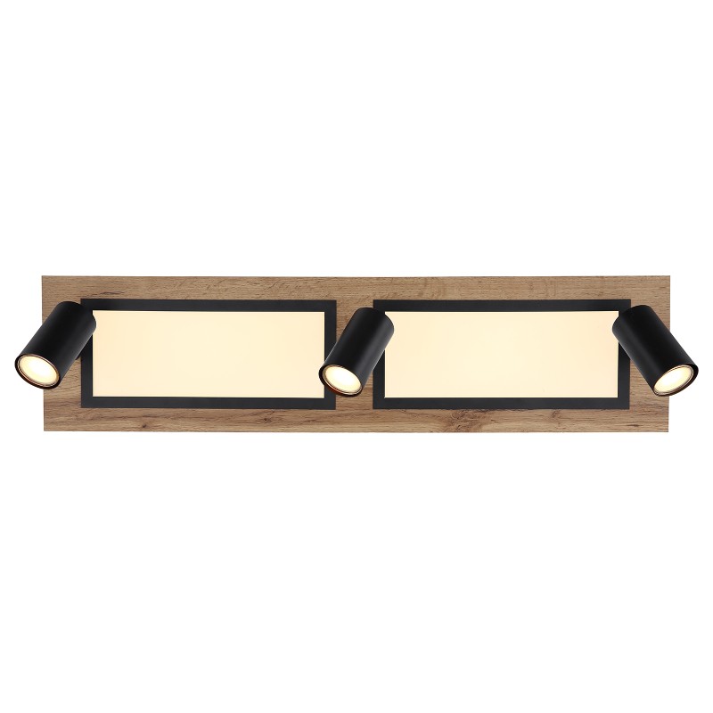 Svítidlo je vyrobeno z černého kovu, MDF s dekorem dřeva a bílého plastu. Tato obdélníková varianta stropního svítidla o rozměrech 20x80 cm je vybavena centrálním LED panelem a čtyřmi bodovými reflektory s paticí GU10.