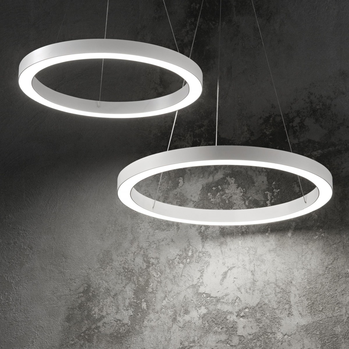 Kruhová konstrukce je vyrobená z kovu s bílou povrchovou úpravou. Uvnitř krhu je integrovaný LED zdroj krytý plastovým difuzorem v mléčné barvě, který zajišťuje rovnoměrné rozptýlení světla po celém prostoru. Hlavní část svítidla je zavěšená na tenkých ocelových lancích, které vycházejí z kovové stropní růžice.