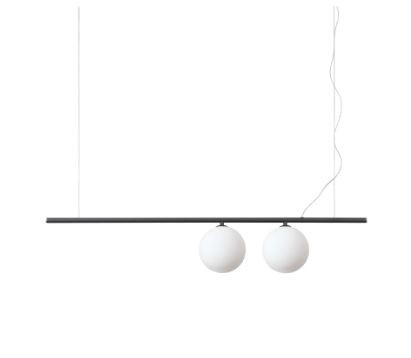 Tenký trubicový rám svítidla je zhotoven z kvalitního kovu s matně černou povrchovou úpravou, která dodává svítidlu moderní a elegantní vzhled. Dva difuzory, vyrobené z bílého foukaného skla, zajišťují jemné a příjemné rozptýlení světla. Dva čiré teflonové přívodní kabely jsou upevněny přímo ke stropu a jejich výšku lze regulovat od 42 cm do 220 cm, což poskytuje flexibilitu při instalaci.
