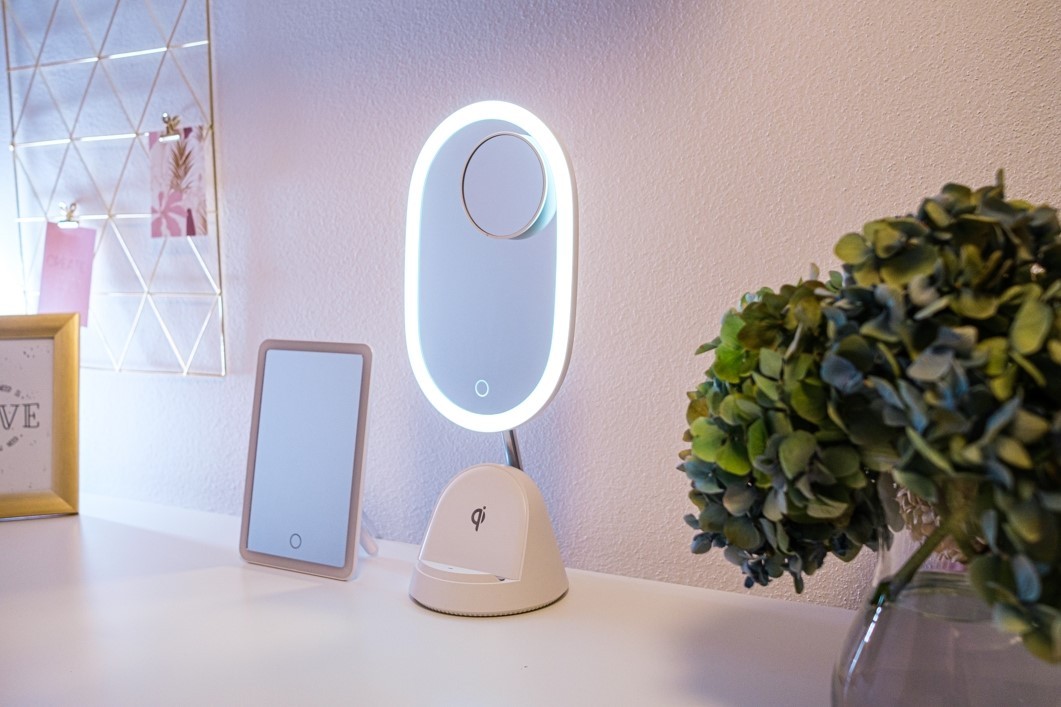 Kosmetické zrcátko efektivně a pohodlně zachycuje širokou oblast obličeje a krku, a jeho přídavné magnetické zvětšující zrcátko (s 3x zvětšením) přesně zobrazuje každý detail, což usnadňuje dosažení dokonalého make-upu. Světlo z LED není oslnivé a zachovává přesnost barev, které je při zkrášlování potřeba. Stojánek na mobil umístěný pod zrcadlem je praktickým doplňkem, který vám umožňuje sledovat trendy videa nebo filmy a seriály přímo během líčení. Pokud váš telefon podporuje bezdrátové Qi nabíjení, jednoduše ho umístěte do stojánku a telefon se automaticky začne nabíjet.