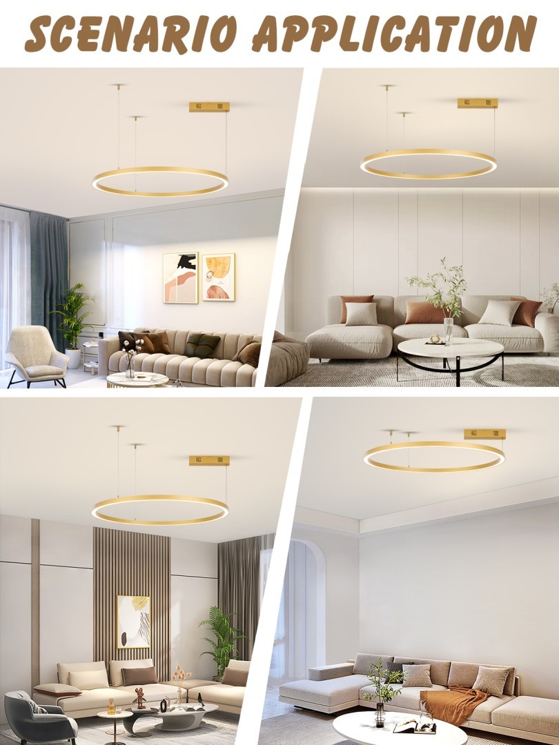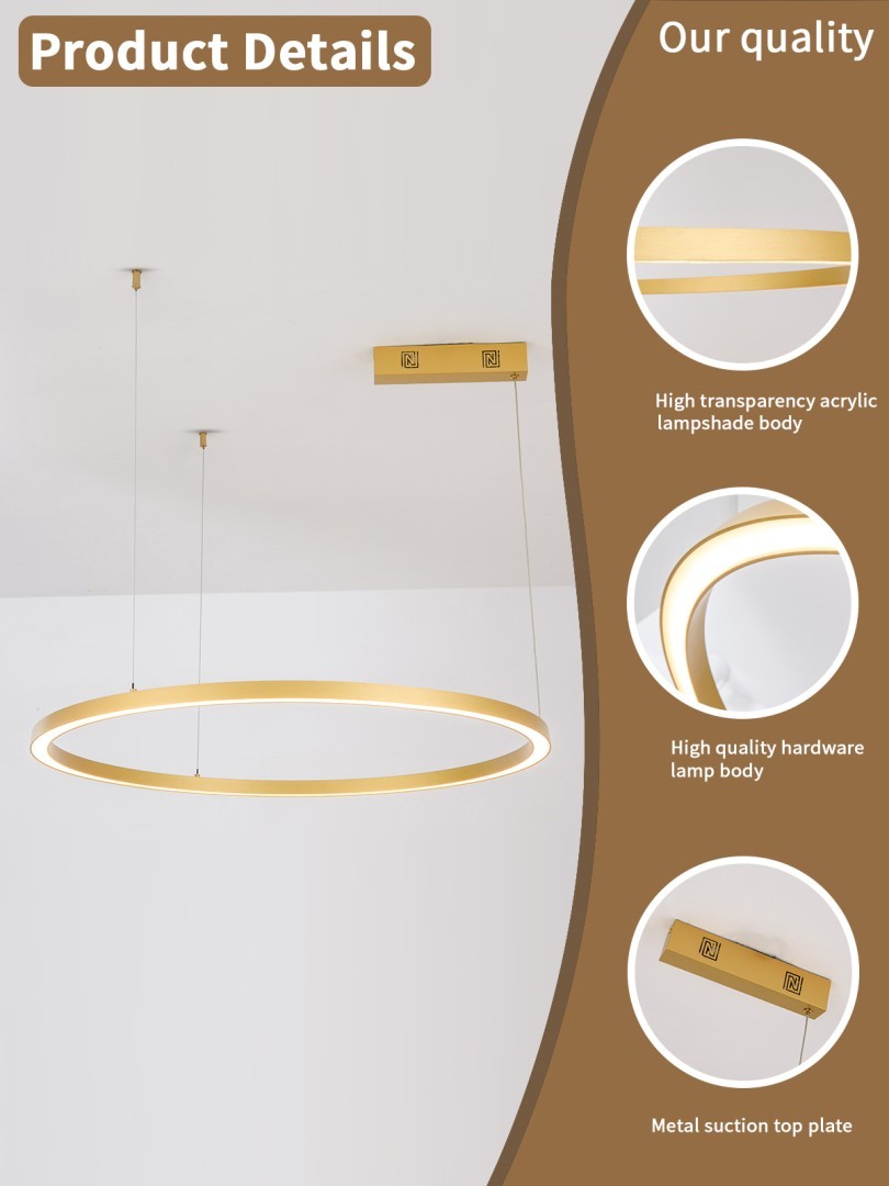Zlaté provedení štíhlého kruhu o průměru 80 cm spolu s novým závěsným systémem umožňuje variabilní zavěšení od 0 do 150 cm.