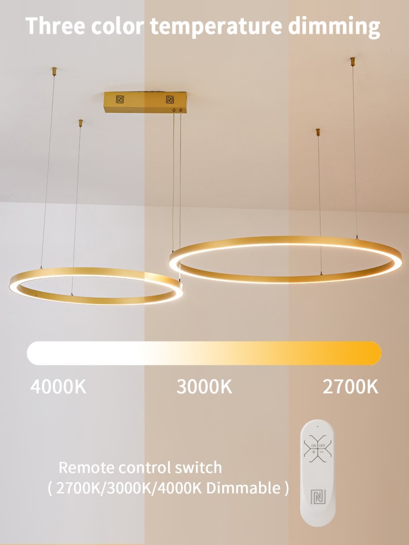 Zlaté provedení dvou štíhlých kruhů o průměru 80 cm a 60 cm spolu s novým závěsným systémem umožňuje variabilní uspořádání – kruhy lze zavěsit nad sebe nebo vedle sebe, čímž lze rozšířit šířku svítidla až na 135 cm.