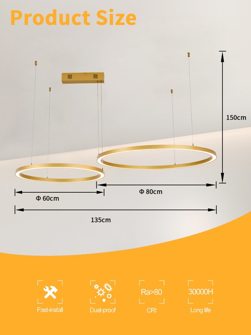 Variabilní uspořádání: Dva kruhy (80 cm a 60 cm) lze zavěsit nad sebe nebo vedle sebe, což umožňuje rozšířit šířku svítidla až na 135 cm