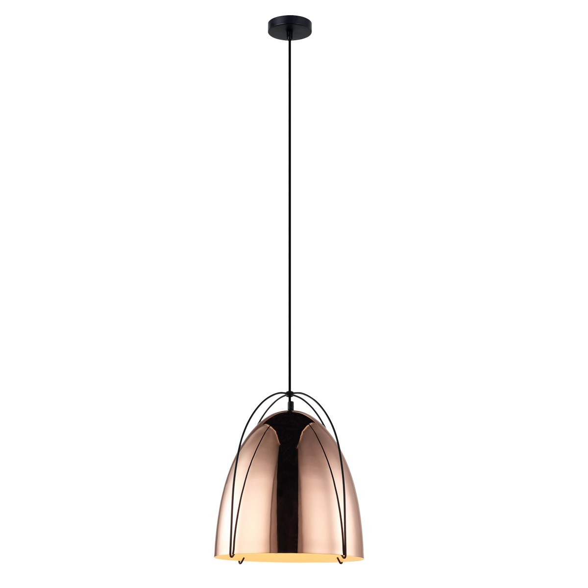 Tělo lustru se leskne barvou mědi a díky decentním křivkám se lustr stane dokonalým doplňkem a ozdobou interiéru. Průměr lampy je 300 mm při výšce 360 mm. Celková výška osvětlení včetně zavěšení je 1200 mm.