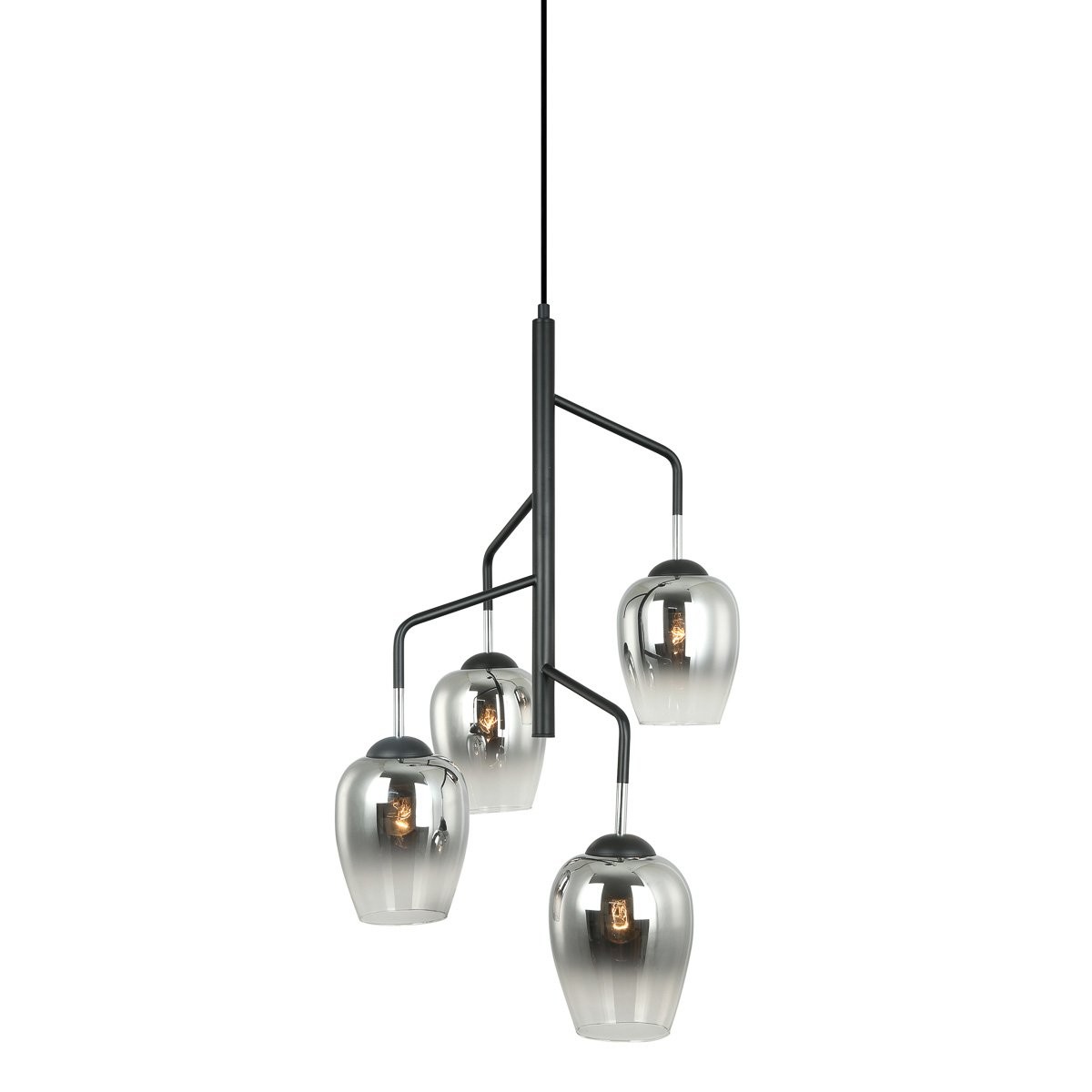 Skleněné lampy v lehkém kouřovém odstínu jsou po čtyřech rozmístěny na ramenech z nerezové oceli, zbarvené do elegantní černé barvy. Lustr je též osazen chromovými prvky. Celé svítidlo se jeví velmi decentně, přesto jeho výrazné tónování působí esteticky i při zhasnutém světle, čímž může barevně doladit charakter celého vašeho interiéru.