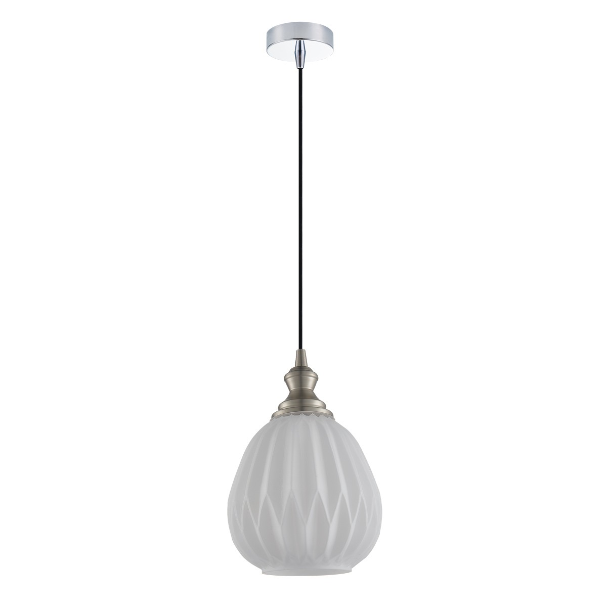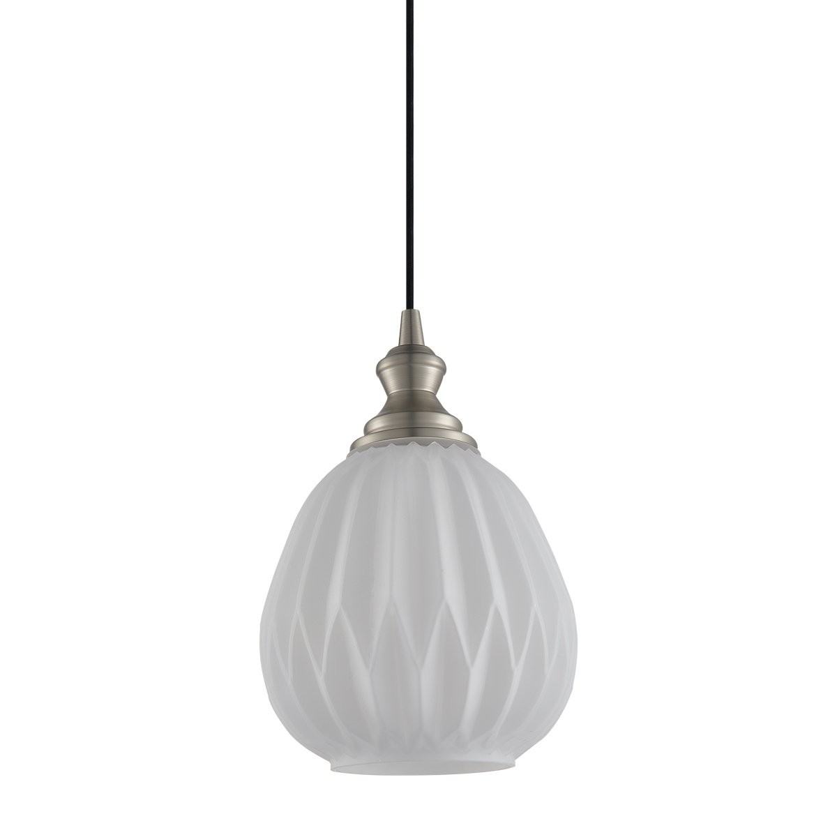 Skleněná lampa s žebrováním dodává rozsvícenému světlu dynamiku, přitom si zachovává svůj půvab i při zhasnutí. Sklo tohoto lustru je tónované, takže barevně doladí váš interiér, ať jde o kuchyň, obývák, či osvětlení baru. Kromě skla je zbytek svítidla osazen kovovými prvky v barvě saténového niklu.