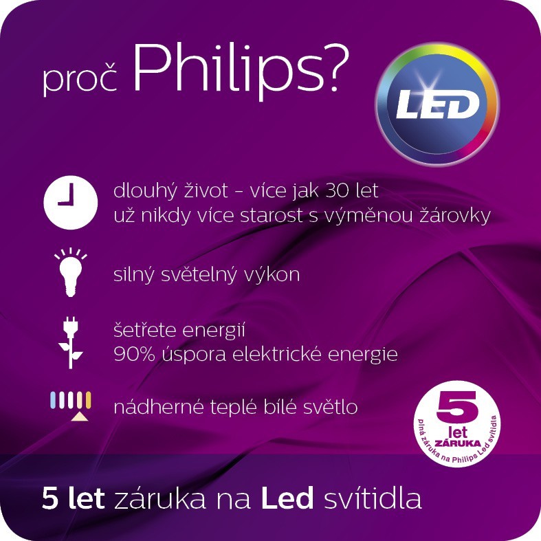 Technologie LED integrovaná v tomto svítidle Philips je jedinečně vyvinutým řešením společnosti Philips. Svítidlo má funkci okamžitého rozsvícení a zaručuje optimální světelný výkon a zvýraznění živých barev vašeho domova.