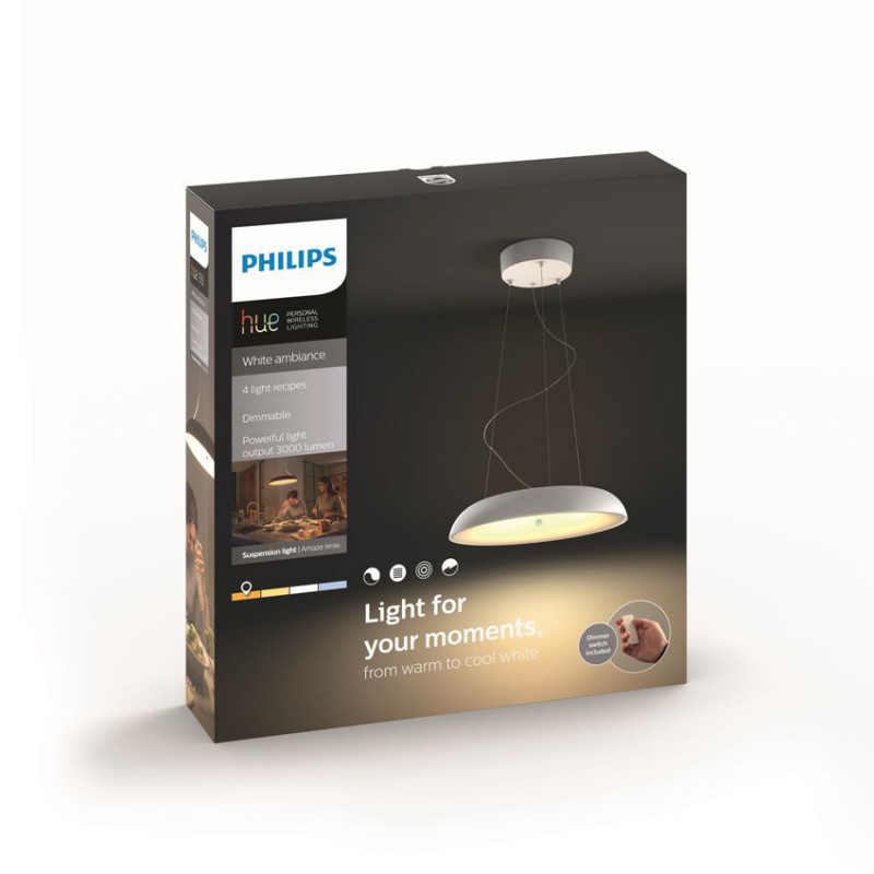 Zapojte do systému Philips Hue bílé ambientní závěsné svítidlo Amaze Philips Hue a vychutnejte si přirozené bílé světlo, při kterém se budete snadněji probouzet, nabírat energii, soustředit, číst a relaxovat. Potěšte se unikátním designérským závěsným svítidlem, které doplní váš interiér.