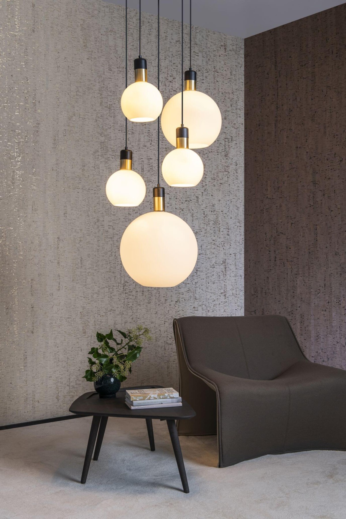 opálovým povrchem, které vytvářejí pevný a elegantní vzhled, jsou zavěšeny na jemných textilních šňůrkách v různých výškách. Každé světlo