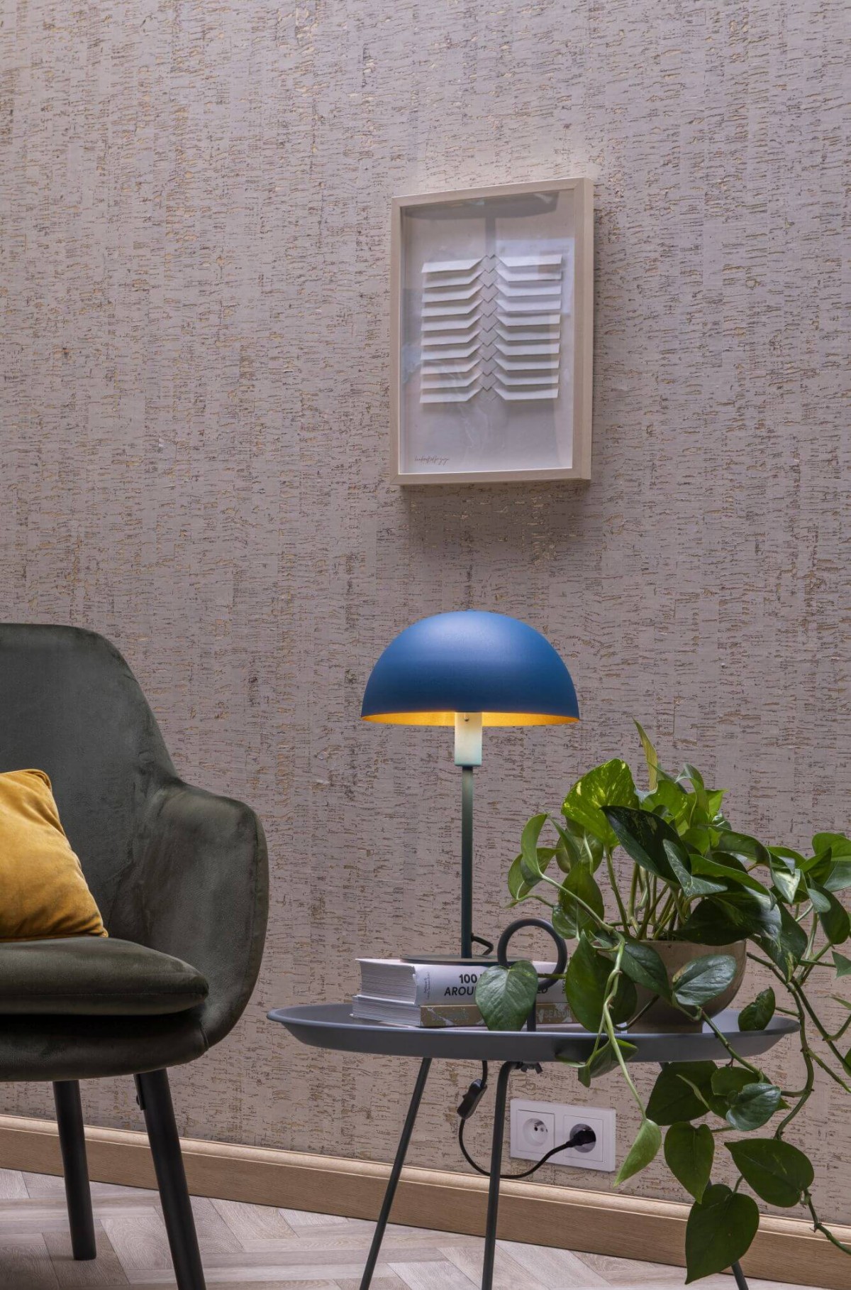 Lampička v modrém provedení je vyrobená z vysoce kvalitní oceli, světelný zdroj je umístěn uprostřed půlkruhového stínidla, které efektivně odráží světlo podél jeho stěn, čímž vytváří příjemnou atmosféru v celé místnosti. Lampička Siemon je snadno ovladatelná pomocí vypínače na kabelu.