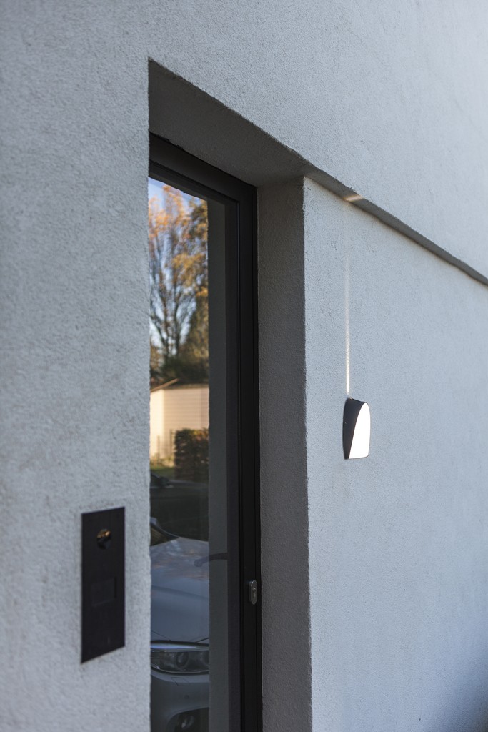 Lampa Apollo je obohacena o vizuální prvek v podobě jemného světelného proužku, jenž vychází z horní části lampy a do ztracena se táhne po zdi fasády. Hlavní zdroj osvětlení zprostředkovává, díky svému promyšlenému designu, čelní strana lampy.