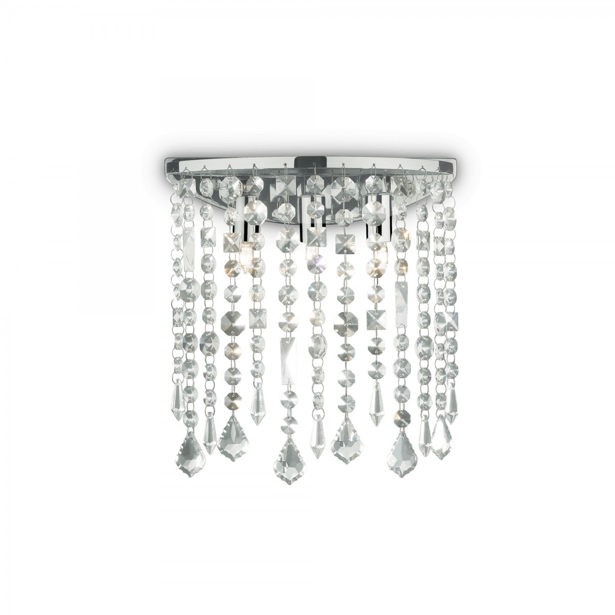 Extravagantní svítidlo z kvalitního kovového tělesa v chromové povrchové úpravě, na kterém jsou zavěšeny ověsy z křišťálových kuliček, čtverců, obdélníků, osmihranů a závěrečných kapek. navlečených na nylonové šňůře.