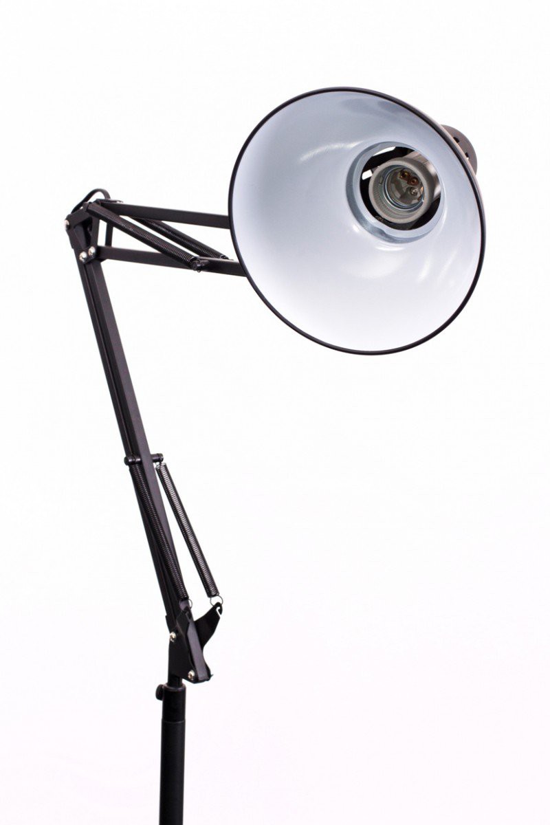 Technická lampa v chromovém provedení nebo smaltovaný kov. Rameno se stínítkem na třech kloubech vyvážené pružinou.