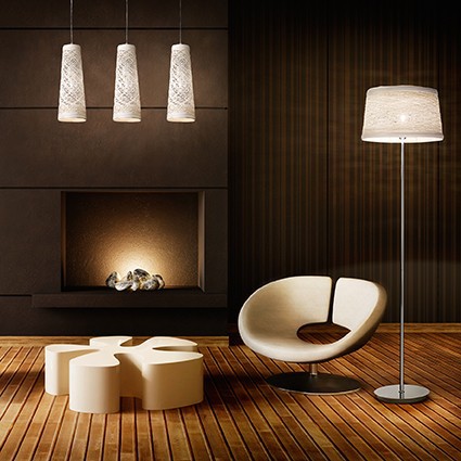 Unikátní a elegantní komplexní osvětlení bytu nebo domu. Kovová základna a rám stínítka je v povrchové úpravě lesklého chromu. Rám stínítka je hustě omotaný přírodním špagátem v krémové nebo černé…
