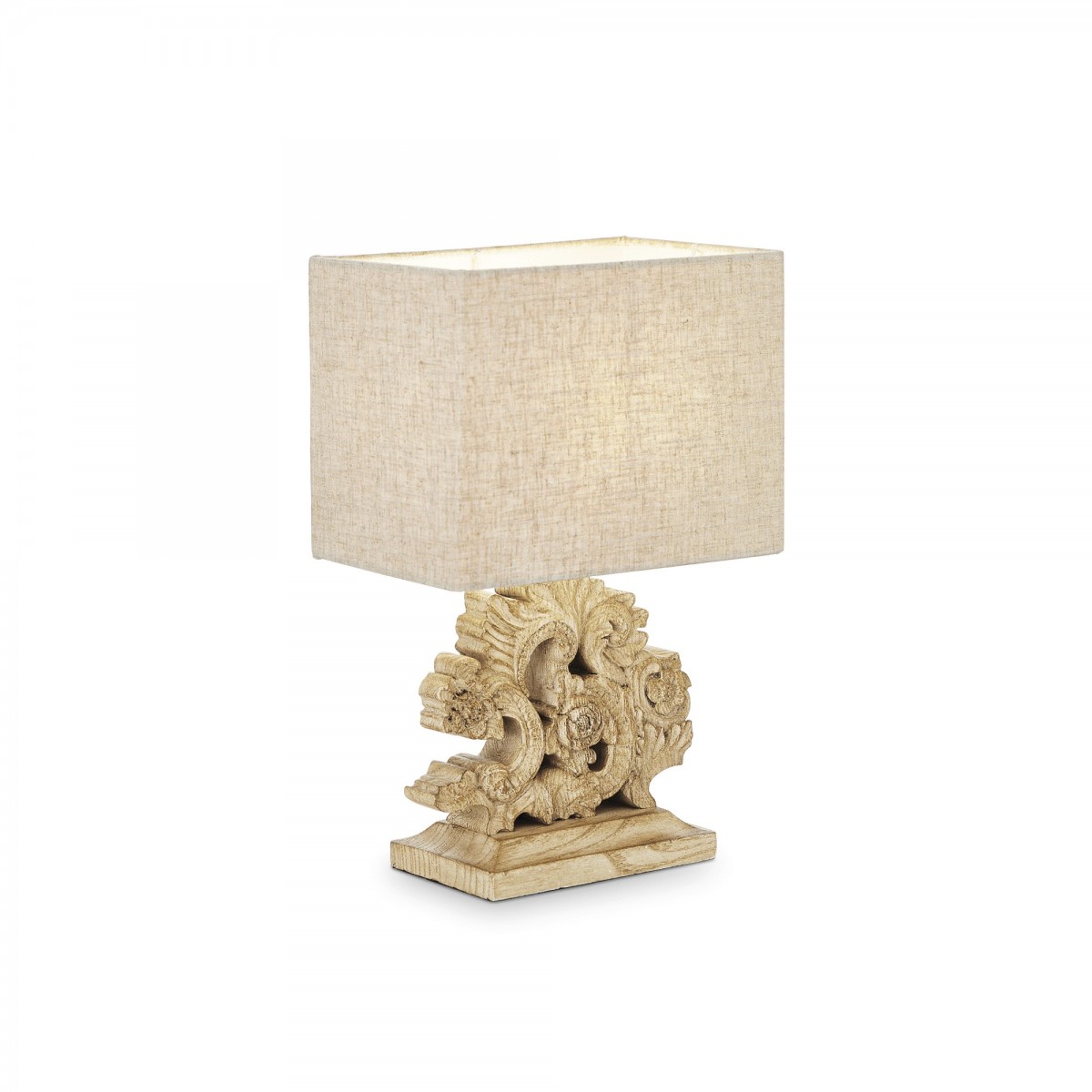 Designově stylové svítidlo z přírodních materiálů, které doplní odpovídající interier k dokonalosti. Stínítko kvádrového tvaru potažené hnědým plátnem v dřevěném rámu, jehož spodní část je z lisované pryskyřice a věrně napodobuje ručně vyřezávané květinové ornamenty. Nádherná a kvalitní práce.