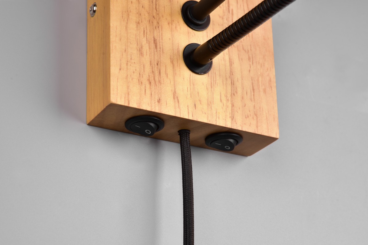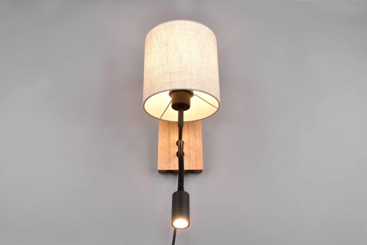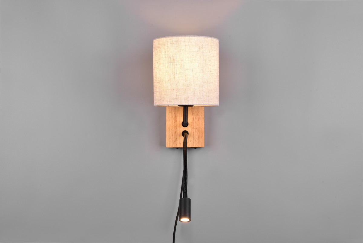 Trio 212879236 nástěnná lampa Nilam 1x28W | E27 + 1x3,1W | 310lm | 3000K | IP20 - ohebné rameno, LED zdroj Osram, oddělené spínání světelných zdrojů, spínač na konstrukci, bílá, dřevo