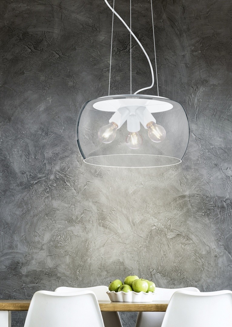 Stropní růžice je vyrobená z kovu s bílou povrchovou úpravou. Tělo lustru drží na 3 tenkých ocelových lancích, které lustru dodávají vzdušnost. Centrální kovová konstrukce je také vyrobená z bílého kovu. Do objímek lze umístit 3 žárovky s paticí E27. Světelné zdroje jsou kryté průhledným kruhovým difuzorem.