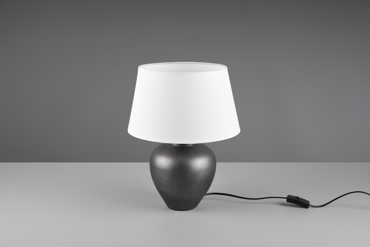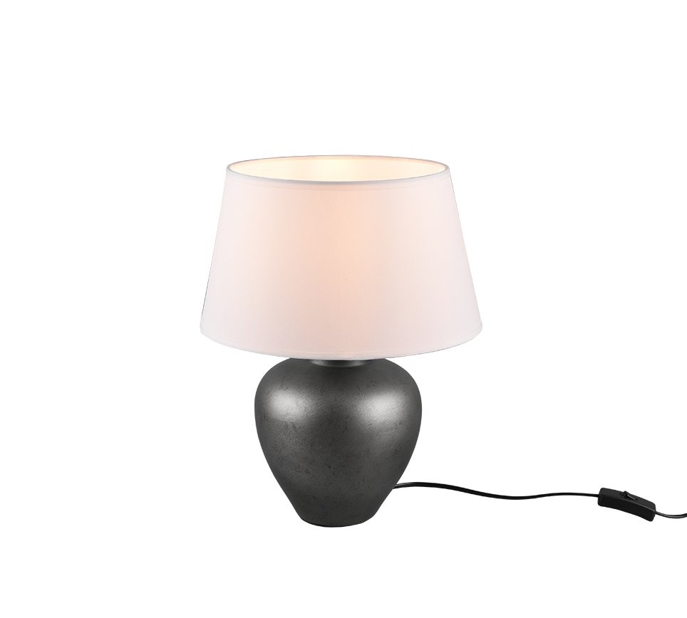 Pod pojmem stolní lampa by si mnozí mohli představit toto svítidlo ABBY s klasickým vzhledem. Působí tak velmi příjemně, protože evokuje pokojné teplo domova. Keramický stojan v niklovém odstínu je mohutný se zaoblenými tvary a nad ním se tyčí stínidlo z bílé tkaniny. Po rozsvícení žárovky se rozzáří do zlatavých odstínů. Na výšku měří 390 mm, lze ho tedy umístit na různé komody nebo stolky. Odtud pak posvítí na pozdní posezení v obývacím pokoji, rozhovory v ložnici nebo zdlouhavou práci u stolu.