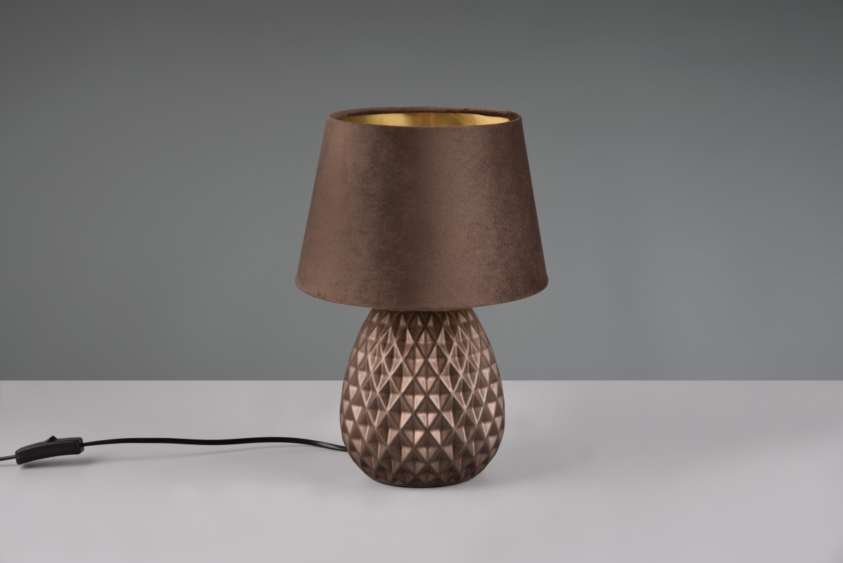 Geometrický reliéf na těle stolní lampy Ariana si pohrává s lomem stínů a vytváří z ní atraktivní dekorativní prvek. Volba hnědého sametového stínidla s vnitřní zlatou částí navíc dodává lampě tu pravou eleganci.