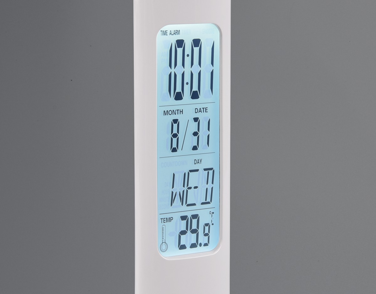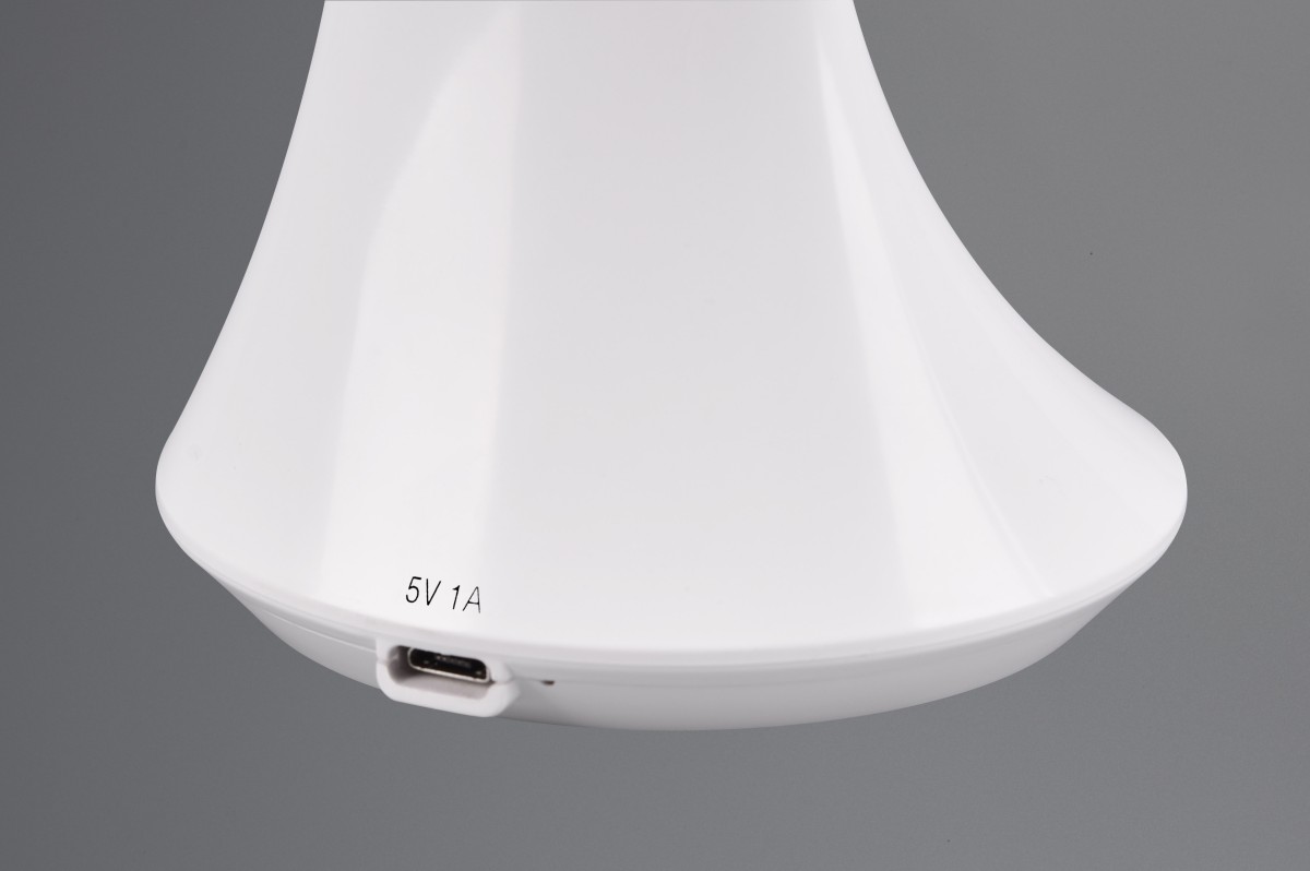 Trio R52311101 LED stolní lampa Patty 1x4W | 380lm | 4000K | IP20 - dotyková funkce o 4 stupních, ukazatel datumu a teploty, funkce budíku, napájeno akumulátorem, naklápění, provoz přes USB-C, bílá