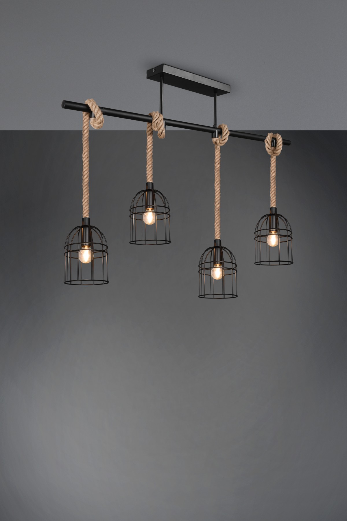 4 matně černými kovovými stínidly, zavěšenými pomocí provazů na