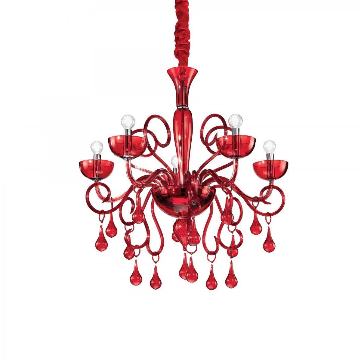 Elegantní rustikální svítidlo tvoří ručně foukané skleněné tělo v červené barvě s chromovými doplňky a ramena se skleněnými dekorativními prvky. Lustr působí velice luxusně.