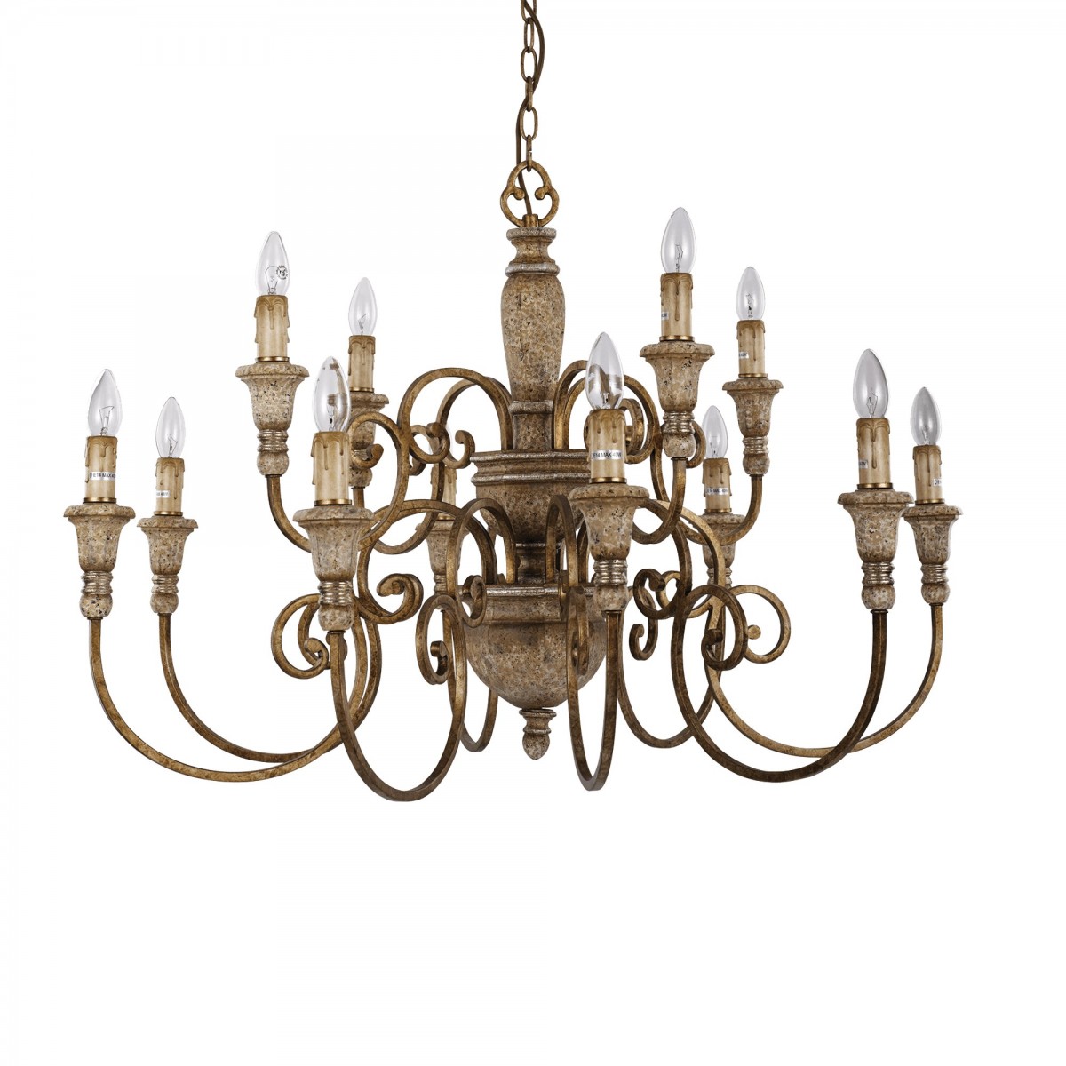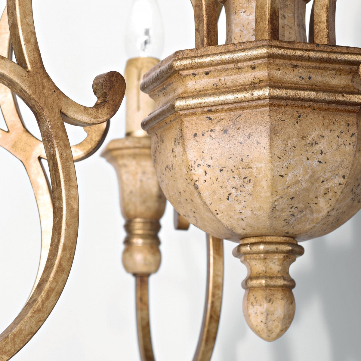 Tělo z lité pryskyřice, dekorativně zdobené prvky, které věrně kopírují tradiční techniky vyřezávání dřeva. Ramena jsou kovová s úpravou povrchu v barvě svítidla. Celek svítidla je ručně zdobený…