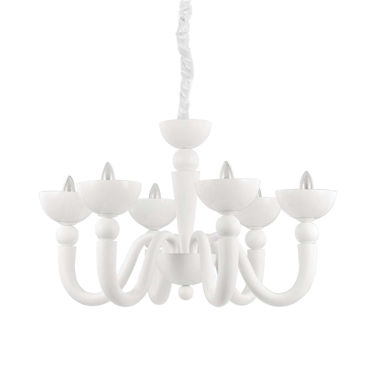 Rám i ramena jsou ručně odlévané z kovu bílé nebo černé matné barvy a stínítka jsou z foukaného skla. Závěsný řetěz je krytý sametem v barvě svítidla.